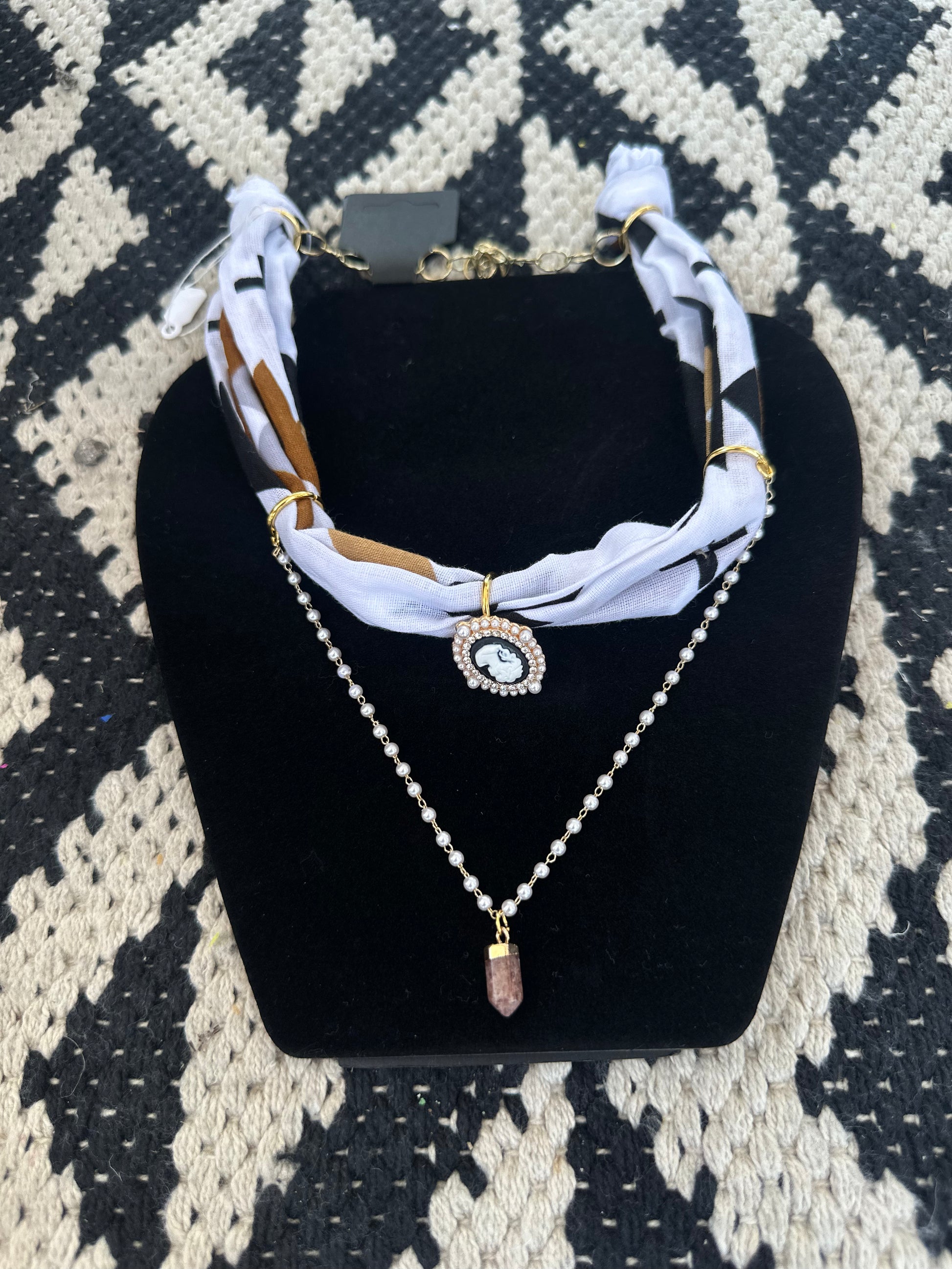 Scarf-Style Necklace with Central Charm and Stone Details – White Boho Print